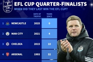 體育資訊12月16日訊 英格蘭聯賽杯八強戰即將開戰,《轉會市場》也統計了八強球隊上次在聯賽杯奪冠距今的時間。