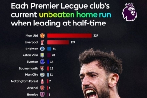 據英超官方統計,曼聯延續著聯賽主場半場領先全場不敗的紀錄,場次達到327場。