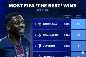 體育資訊12月17日訊 FIFA年度頒獎典禮結束,登貝萊獲FIFA年度最佳球員,德轉列各俱樂部球員獲FIFA年度最佳球員次數,巴薩12次居首,皇馬10次第二,尤文、米蘭、國米、巴黎4次并列第三。