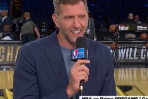 體育資訊12月17日訊 NBA杯決賽,馬刺vs尼克斯。諾維茨基擔任現場解說嘉賓。