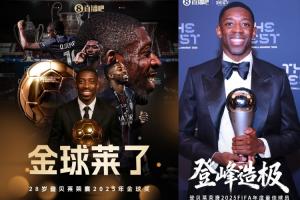體育資訊12月17日訊 登貝萊榮膺2025FIFA年度最佳球員,包攬2025金球獎和2025FIFA最佳兩項大獎。