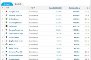 俱樂部身價(jià)方面,上海海港以1608萬歐元排在全聯(lián)賽第一,上海申花以1281萬歐元排第二,北京國(guó)安以1276萬歐元排第三,山東泰山以1158萬歐元排第四,浙江以1155萬歐元排第五,成都蓉城以1051萬歐元排第六,其余球隊(duì)均低于1000萬歐元。