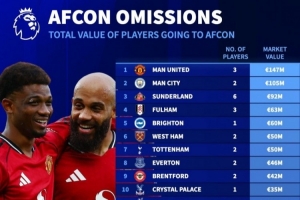 體育資訊12月17日訊 非洲杯即將戰(zhàn)火重燃,《轉(zhuǎn)會市場》也統(tǒng)計了因為要參加非洲杯而離隊的英超各隊身價損失榜,曼聯(lián)居首。