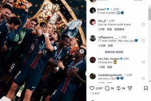 在巴黎身披7號的克瓦拉茨赫利亞社媒曬出捧杯照片,慶祝球隊奪冠,配文:“7是不錯的數字。”