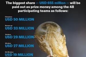 體育資訊12月18日訊 國(guó)際足聯(lián)官方昨日公布2026世界杯的獎(jiǎng)金分配方案,獎(jiǎng)金總額7.27億美元,冠軍獎(jiǎng)金5000萬美元,參賽即可拿1050萬美元。