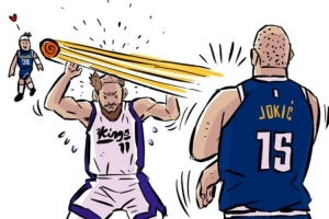 體育資訊11月6日訊 在之前掘金對陣國王的比賽中,約基奇貼著多曼塔斯·薩博尼斯頭皮傳球的一幕,被漫畫家Jay Kim創作出一幅搞笑漫畫。