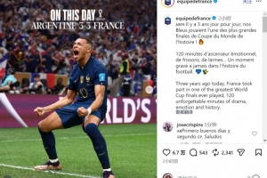 法國(guó)隊(duì)官方社媒曬出姆巴佩慶祝進(jìn)球的照片,配文:“3年前的今天,法國(guó)隊(duì)參加了史上最精彩的世界杯決賽之一。那是120分鐘令人難忘的戲劇性、情感與歷史時(shí)刻的交織。”