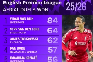 此外,范戴克爭頂成功率為80%,在所有至少參與25次及以上爭頂的球員中,成功率最高。