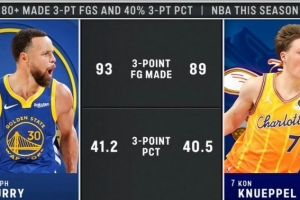 黃蜂主場迎戰(zhàn)老鷹,轉播方曬出新秀克尼佩爾的數(shù)據(jù),本賽季僅有兩位球員在命中率40%以上的情況下命中了80記三分球,分別是: