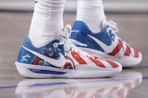 本場比賽,康寧漢姆穿上了客制版本的Nike GT Cut 3 PE,在美國隊長主題基礎上,將個人Logo融入到了美隊的形象當中。
