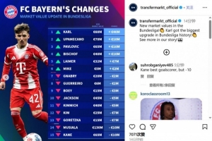 體育資訊12月19日訊 德轉公布了拜仁球員的身價變化,其中,小將倫納特·卡爾的身價上漲了4000萬歐元,來到6000萬歐元,凱恩和穆西亞拉的身價都下降了1000萬歐元。