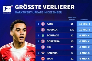 體育資訊12月19日訊 德國轉會市場列出了德甲身價下跌榜,凱恩、穆西亞拉身價下降1000萬歐居首。