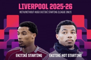 數(shù)據(jù)統(tǒng)計(jì)顯示,埃基蒂克本賽季英超首發(fā)情況下,利物浦10場7勝1平2負(fù),場均打進(jìn)2球、獲得2.2分。