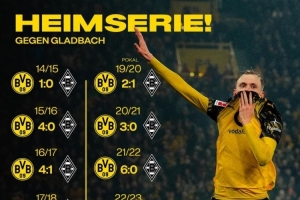 多特官方社媒曬出主場對陣門興的戰績圖片,慶祝球隊取勝,近13次主場對陣門興,多特全部取勝。
