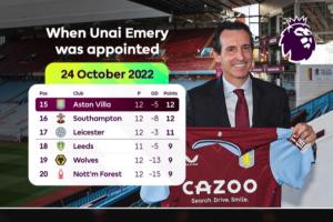 22/23賽季埃梅里于2022年10月底接手維拉,當時維拉排名英超第15,該賽季結束后維拉排名第7。隨后的23/24賽季維拉排名第4,24/25賽季排名第6,本賽季至今暫列第3。