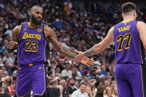 詹姆斯出戰的比賽,東契奇場均36.2分8.3板9.6助攻,真實命中率61%,勝率77.8%(7勝2負);