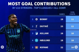 體育資訊12月20日訊 《轉會市場》統(tǒng)計了本賽季五大聯(lián)賽U23前鋒各項賽事參與進球情況,博尼、埃基蒂克各參與11球最多。