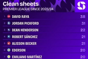本場過后,從23-24賽季算起(注:拉亞在2023年夏天加盟阿森納),拉亞在英超比賽中已38次零封對手,該統(tǒng)計數據排在同期英超各隊門將榜首(排在第2、第3位的分別是皮克福德,迪恩-亨德森)。