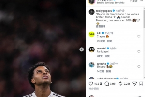 羅德里戈賽后社媒寫道:“‘風雨過后,陽光總會重現,保持信念????’感謝伯納烏,2026年再見。”