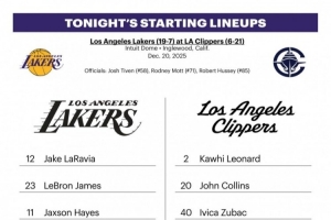 體育資訊12月21日訊 湖人和快船官方公布了今日比賽的首發陣容。