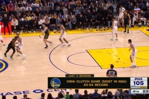 比賽第四節雙方雙方比分緊咬,轉播方曬出一組數據:勇士近3個賽季打了109場膠著比賽(含本場),為聯盟最多!