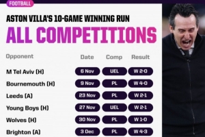 在球隊作為頂級聯賽俱樂部的111年時間里,維拉首次取得正式比賽10連勝。而且,這也是他們自1990年以來,首次在頂級聯賽中取得7連勝。