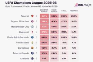 體育資訊11月06日訊 歐冠聯(lián)賽階段第4輪的比賽已經(jīng)全部結(jié)束,OPTA超算更新了歐冠奪冠概率。