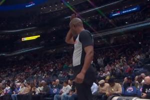 GIF-文班跳球時(shí)肘到裁判腦袋 裁判問題不大繼續(xù)執(zhí)裁比賽