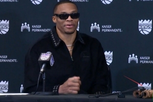 賽后,威少戴著墨鏡參加新聞發布會,看起來心情很不錯,他貌似還帶著一節雙節棍參加發布會,當記者問這是不是雙節棍時,威少笑了笑沒有回答,繼續接受采訪。