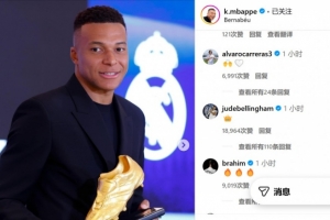 體育資訊11月1日訊 由于上賽季的出色表現,皇馬射手姆巴佩奪得職業生涯首個歐洲金靴獎。在社交媒體上,法國人發表了自己的感受,而隊友貝林厄姆則和他進行了互動。