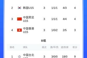 積分榜方面,U15中國隊與韓國U15同積4分,相互戰績一致(第二輪交手成績1-1),但小組凈勝球落后對手1球,最終排名第三收官。