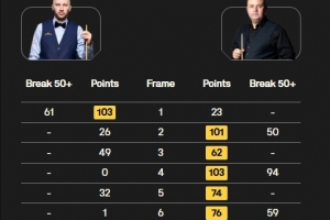 最終,馬奎爾6-1淘汰舒爾第,挺進(jìn)四強(qiáng),迎戰(zhàn)希金斯與墨菲間的勝者。