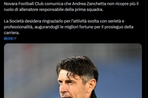 體育資訊12月23日訊 意丙球隊諾瓦拉宣布,前國米青年隊教練贊切塔下課。