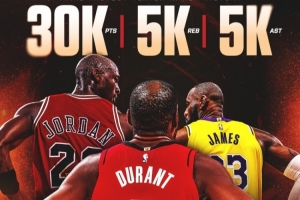 火箭官方也曬圖致敬杜蘭特這一偉大時刻,他們寫道:“又一項歷史被創造 ??杜蘭特成為NBA 歷史上第3快達成 30000+ 得分、5000+ 籃板、5000+ 助攻的球員?!?/p>