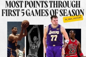 在賽季的前五場比賽中,東契奇合計得到200分,歷史第三高,僅次于張伯倫的兩次表演,詳情如下:
