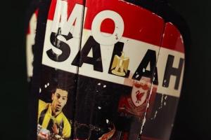 板上印有他在埃及國家隊穿10號球衣的圖案,以及利物浦主場通道里“這里是安菲爾德”的著名logo。
