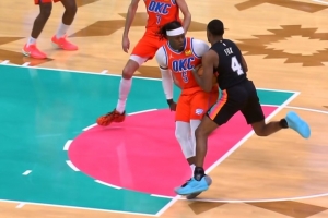 GIF-雷霆挑戰多特這個防守犯規,但腿部有接觸,挑戰失敗