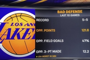 湖人過去10場5勝5負,場均失分121.6分(聯盟第六差),對手投籃命中率47%,對手場均命中12.2個三分。