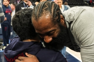 彼此的幸運(yùn)符?!哈登賽前與中國留學(xué)生約翰·郝?lián)肀Р⒑嫌?/p>