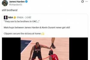 賽后,NBA官推曬出哈登與杜蘭特對位的集錦,并配文道:“他們在雷霆時曾經是兄弟,哈登與杜蘭特的對位百看不厭,快船在主場確保了勝利。”