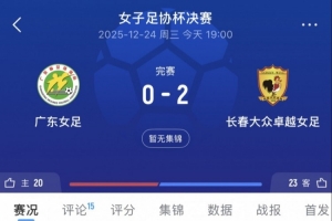 中國女子足協杯決賽今晚在廣東省肇慶市肇慶新區足球場進行,長春大眾卓越女足vs廣東省女足,閆琪、桑德琳·尼永庫魯各入一球,最終長春女足以2-0的比分擊敗對手奪得冠軍,這也是吉林省首個足協杯冠軍。