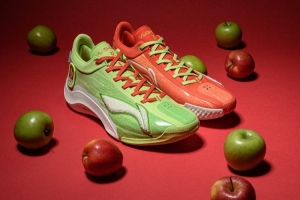 球鞋采用鴛鴦配色,鞋面還帶有類似蘋果的紋理,而在鞋后跟處,分別寫著拼音拼寫的楊瀚森姓名還有“young handsome”。