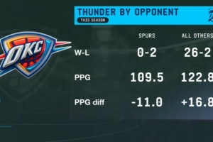 雷霆本賽季對陣馬刺戰績0-2,場均僅109.5分,場均凈負11分