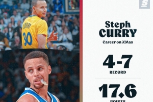據統計,庫里生涯至今共出戰11次圣誕大戰,戰績為4勝7負,期間場均可以得到17.6分6.4助攻,三分命中率僅28%。
