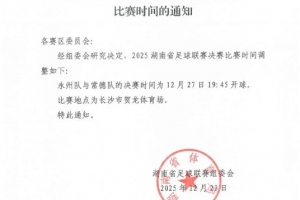 湖南省足球聯賽組織委員會發布通知,調整2025湘超決賽比賽時間,永州隊與常德隊的決賽時間為12月27日19:45開球,比賽地點為長沙市賀龍體育場。