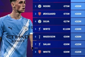 體育資訊12月25日訊 德國轉會市場公布了新一期的球員身價情況,進入2025年后,英超多名球星身價出現大幅下跌。德國轉會市場盤點了2025年英超球員身價下跌榜,曼城兩將福登和羅德里分別下跌6000萬歐元和5500萬歐元位居前二。