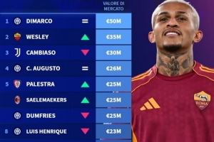 體育資訊12月25日訊 德轉本周更新了意甲最新身價,今日德轉曬出了意甲邊后衛的身價TOP10榜單,迪馬爾科5000萬歐繼續排在第一,羅馬右后衛韋斯利升至3500萬歐超越坎比亞索來到第二位。