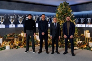 體育資訊12月25日訊 今日是西方傳統節日圣誕節,皇馬官方社媒曬出皇馬主席弗洛倫蒂諾、主帥阿隆索和兩大隊長巴爾韋德、卡瓦哈爾的合照。