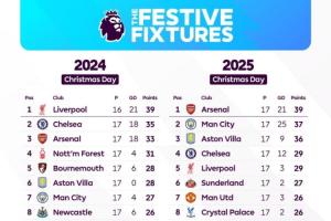 上賽季節禮日,利物浦積39分排名聯賽榜首,而他們最終也獲得了上賽季的英超冠軍;本賽季,阿森納同樣積39分獲得了節禮日榜首,他們目前領先第2的曼城2分,但此前槍手4次圣誕榜首最終都未能奪冠。