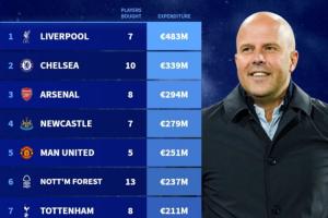體育資訊12月26日訊 德轉統計了本賽季俱樂部引援花費排行,利物浦4.83億歐領跑,前十英超球隊占9席。